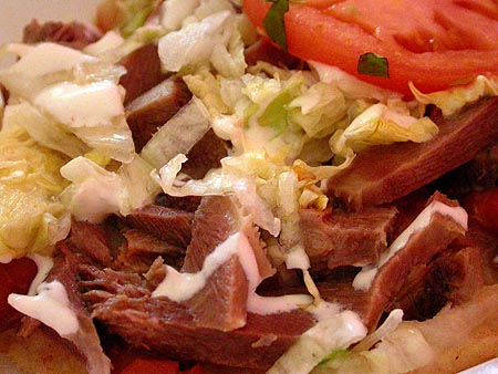 with much excitement i made it back home. the huaraches came with two sauces, both spicy, one that's sort of a chipotle, the other a mild jalapeño. the tongue was served on top of a fresh corn tortilla along with beans, cheese, lettuce, and cream. the serving could've been bigger (only because i was so hungry), but it was really delicious, not your usual flavors. the term "party in my mouth" has probably been overused, but i feel in this case it's valid. the choice of tongue is probably not for the squeamish, but it's really good, tender and crunchy, and occasionally you can see the taste buds (sort of like tripe, another one of my favorite mystery meat). i washed everything down with a cold tamarind soda. who would've thought that a taste of el salvador could be had so close to home? i plan on keeping the place a secret though, i don't want to spoil it.