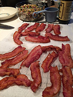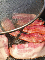 i soaked 2 cups of mixed beans overnight. around 5:00 i started making the soup. i began early because it takes an additional few hours of simmering for the soup to be ready. since the bulk of the ingredient was beans, i didn't need any additional protein, but i added some bacon anyway. and by some i mean a whole package of bacon, because it's such an ordeal to cook it, i thought might as well cook it all, regardless if i use it or not. today wasn't that cold outside (50°) so i didn't waste too much heating running an exhaust fan from the window. i cooked the bacon in a big pot to prevent oil from splattering everywhere, and i also used a mesh splatter guard.