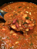 while the bacon was cooking, i chopped up half an onion, two stalks of celery, and some garlic. after the bacon was done (let them dry off on some paper towels), i poured out most of the bacon fat, saving just enough to sautee the chopped vegetable ingredients. i also chopped up the bacon on the side (used a little more than half, saving the rest of a rainy day). i added the bacon bits into the pot, along with 4 cups of water and a bouillon cube. i also added a health dose of pepper powder. and for a health kick, i sprinkled about a cup of frozen kale. recipes called for anywhere from 1-3 hours of additional simmering, but the beans were ready after 30 minutes (maybe because i started soaking them since early yesterday), and after a full hour i turned off the heat. the soup was ready just like that, but a lot of recipes called for the additional of crushed tomatoes so i added a can, even though i'm not a big tomato fan.