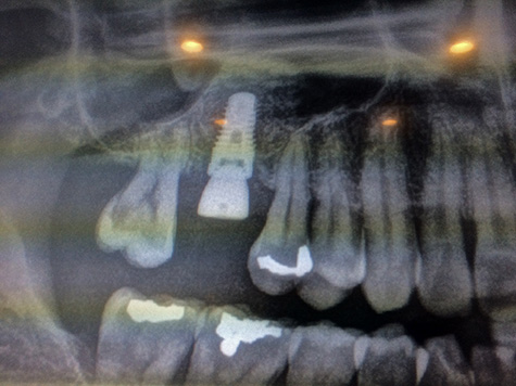 back in the operating room, we looked at the x-ray. now instead of an empty gap was the silhouette of the dental implant. i now officially join the ranks of metahumans in being part flesh and part metal! when i asked the doctor if it was a titanium implant, he said no, but something even better, even though he didn't say what it was. the operation was a complete success, no complications whatsoever. my sinus cavity was intact, just pushed up a little bit to make room for the additional bone graft. my right nostril felt stuffed up, the doctor said this was normal after a sinus lift (it cleared up soon after i left). he said that my jawbone was the optimal hardness level (scoring 35 on this fancy bone hardness meter), so the implant is extremely stable.