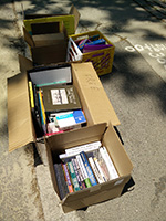 i left for belmont a bit before noontime, having only taken a shower with no breakfast. with harvard's graduation just last thursday, a lot more students are moving out this weekend, and i came across numerous piles of leftovers on the sidewalks (cd's of bagpipe music? no thanks). the best was on huron avenue, several boxes of books: on law, on sailing, on competitive cycling, on marathons. i found a copy of the AIA guide to boston (unfortunately only the 2nd edition, not the latest 3rd edition); i already have one, but it'll make a nice gift for any future house guests interested in boston architecture. i also picked up a large hardcover for a hollow book conversion.