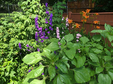 finally, splashes of colors in my garden, in the northeastern corner, where i've planted several perennials. purple-pink-white spires of delphinium flowers poke out from the green foliage, and orange daylilies flower on tall stalks. down below are lupines and a few past season milkweed. i hope they can survive despite being eclipsed by the taller plants. in front i planted a row of mixed sunflowers; once they bloom i'll get another wave of colors.