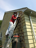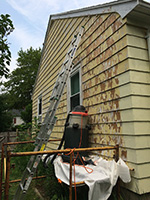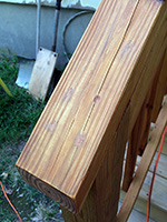 i arrived in belmont by 9:00 via bicycle (left my place around 8:40, riding the bike with the wheel that i just fixed last night), started sanding by 9:30 after eating a greek yogurt for breakfast. in order to get a higher reach, i balanced the shop vac on top of an overturned trash bin. i finished by 1:00. my father had already sealed the wooden railing of the back steps, despite the fact that we weren't finished patching up the holes yet. he also did a sloppy job, dripping still all over the steps.