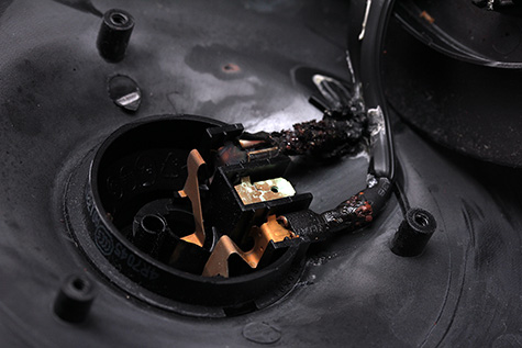later in the evening i went to go investigate my electric kettle. i bought it used back in august 2010 and it's been very reliable up until now. taking apart the base was just a simple matter of unscrewing 3 screws. what i found inside was horrifying: the wires were frayed and melted, super dangerous, definite fire hazard. i'm glad i noticed the problem before using the kettle again, because it could've burned the house down.