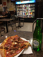 when deanna finally came home, i took the opportunity to go out briefly to get something to eat. that something was giardini the corner pizza shop. 2 slices of pepperoni/sausage brooklyn-style pizza with a soft drink was $10!
