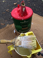 my father had already painted the basement windows with the final coat of semi-gloss white by the time i arrived in belmont by 10am. temperature gun reading said the house exterior was in the mid-40's, which was warm enough for acrylic. we opened the first can of final paint, sweet pear, and began painting the outside walls of the garage. while i edged with a combination of traditional and foam brush, my father was up on the ladder on the roof painting the corner area. the whole time i was also documenting our work with my action camera set on 1 sec time lapse.