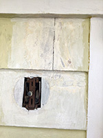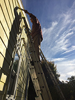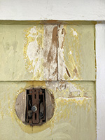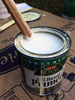 my father removed the front porch light so i could better sand the area and later prime and paint it. while he edged the western side of the house, i painted the alcove area by the rear entrance, around the door, along the railing, and some shingles. i then sanded the area around the front porch light and applied a coat of old primer. it went on a little thin, but later when i touched it middry, i could feel it was a little grippy, which is what you want with a primer coat. in the second half, my father and i both edged the front of the house, with me working the detail areas around the windows and below the fascia, while he edged below the shingles.
