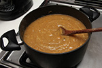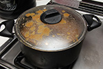the problem with my membrillo attempt is i was using used quince pulp - now blended into a thick puree. calling it puree seems wrong, it's actually more like a paste. i estimated that i had 6 cups of quince paste. when i tried to heat it in the pot it nearly burned because there was hardly any liquids left in the paste. and when it did manage to heat, the trap air would erupt like an explosion. i ended up adding about 2 cups of water just to reconstitute this concentrated quince solids. that made it better at first, while i then added 6 cups of sugar as well. but as the blend started to heat up, it would bubble molten sugared quince pulp everywhere. so i put the glass lid over the pot. but every few seconds the puree would bubble on the inside, and every time it would shake both the pot and the range grills. it was a very noisy, very messy, very dangerous affair all around. and i had to do this for the next 1-1/2 hours. membrillo seemed like more hassle than it's worth.