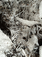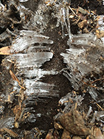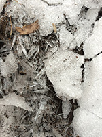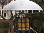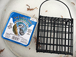 i was hoping to see some birds at the suet feeder but the feeder was empty, that last piece of suet finally eaten, either yesterday (during the storm) or earlier today. i climbed down the icy steps and put in a new suet block, "woodpecker treat." i heard birds chirping overhead but couldn't see them. later from inside i saw some sparrows coming to the feeder, which i promptly scared away. i didn't see any other birds after that.