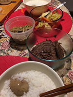 my father came home early in the afternoon. since he was fasting, he decided to take a nap to make the time go faster. at 6pm he drank a bottle and a half of magnesium citrate, followed by a bottle of gatorade. my mother and i had some simple rice porridge along with my year old sichuan paocai. the fermented vegetable had lost all its crispiness but still flavorful. there was no carbonation.