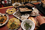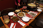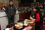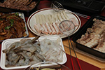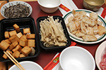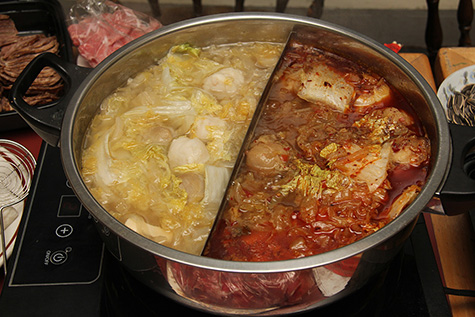 i used a package of chongqing hot pot base, about 3/5th the bag. it's a liquid (oil) base, with some solids which are probably the peppercorns. i never used it before but it has a really good flavor, would definitely buy it again. to make it more authentic, i would probably add even more sichuan peppercorns, and a layer of dried hot peppers for presentation. i ate standing up for most of the time, as the way the tables were set up it was hard for me to reach the hot pot.