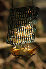 the oriole seems to have made the suet feeder her own. it makes sense, since it's still too early for insects and berries, so the only thing there is to eat is the suet cake. i don't know if she's eating the suet itself or the seeds inside. i also see her stopping occasionally to wipe the suet off her beak on the grass or a branch. i had my dSLR today so managed to get better resolution photos (using the 70-300mm lens). from some of the photos one can definitely see the orange hue on the chest area, indicative of baltimore orioles. it was feeding from the suet feeder so long that none of the other birds dared feed at the same time. on a few occasions downy woodpeckers swooped by but quickly fluttered away. the downys only returned whenever the oriole wasn't around.