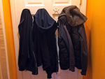 once i got home i began installing my double robe hooks onto the closet door in the foyer. i first taped the hooks onto the door so i could figure out their final positions. then i drilled 3/32 pilot holes before hand-turning the screws. these hooks are pretty solidly mounted, i don't think they're ever going to come off! i tested out some jackets: light and medium jackets are okay, but a heavy winter coat might present some problems because it's so puffy.