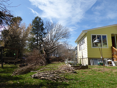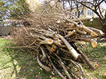 after some rice porridge for lunch in belmont, i was out in the backyard, trying to reduce the branch pile as much as possible before the snowstorm that'd arrive later today. there were first some smaller piles i still had to tie up into bundles. i used some hemp rope but they were too stringy and kept on breaking. i found a coil of thicker hemp rope (for pitching tents?) that was much better but only a limited supply.