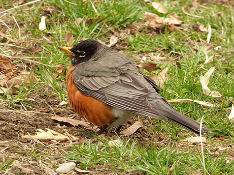 a lot of bird activity in the backyard, but no new birds to report. i was startled when i saw something skittering out from the pile of cold frame debris between two raised beds. i thought it was a rat at first, but then saw that it was only a robin. could it be the robin i saw yesterday? why is it still lurking around the yard? maybe it's trying to build a nest nearby. i was surprised by how tame it was, only hopping away far enough so i couldn't catch it, instead of just flying away.