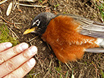later, from the living room, we were watching the birds visiting the feeder. of in far end of the lawn i noticed something odd, like a pile of reddish-colored leaves, but thought nothing of it. maybe it's a dead bird i thought to myself jokingly. some time had past, and i picked up some binoculars to spy on a squirrel that looked like it was about to cause some mischief. as an afterthought, i panned to the mysterious pile i saw early, and realized what it was: an actual dead bird!