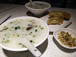 until i told her it was a year expired, and the effect sort of wore off. we went in search of some light brunch, something to calm our stomaches. around 11am we went down jianxing donglu and found a old wu wonton shop that also served breakfast porridges. we each got the thousand year old egg porridge with pork along with a serving of pan-fried dumplings and hot soy milk.