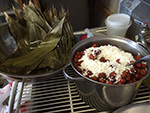 i learned how to form the bamboo leaves into a pocket, and how to pack the pocket and wrap it up tightly without it falling apart (the trick is squeezing the packet into a t-shape). however i did not learn how to wrap up the packet with string. my mother was helping me at first, until i realized it was taking away too much of her time from wrapping additional zongzi, so i sort of gave up after a few tries, since she could work faster without having to supervise me as well. i did wrap at least 2 sweet (with dates) zongzi (but she tied up both of them).