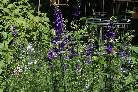 i swung by my garden plot to do some more weeding. i pulled out some ground ivy, some mint, some grass. the delphiniums have flowered, with more blooms to come in the following few weeks. they range in colors from white to deep purple, with a few pinks. no blues though. i searched through the rest of the community garden, i think i'm the only one growing delphiniums this season. i think the delphiniums are what's keeping my plot from looking like nothing's been planted, because honestly, i haven't transplanted anything plants yet. everything sprung up on their own so far.