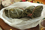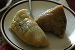 in belmont my mother and i tried the zongzi i bought on a chinatown street corner, one taiwanese style, one cantonese style. each one was wrapped in 4 pieces of thin bamboo leaves. the taiwanese zongzi was tetrahedral in shape and stuffed with boiled peanuts, mushrooms, and some pork. my mother complained that there wasn't enough meat, given how cheap the price of pork is. the cantonese zongzi was rectangular, stuffed with just pork and yellow bean paste. it wasn't as flavorful as the taiwanese zongzi.