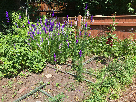i planted the eggplants which was an ordeal in the hot weather. by the time i was done, my face was covered in sweat, streaking all over my glasses. there's probably a good reason why nobody visits the garden in the middle of the day. i got the hose and watered the garden. i also did a bit of weeding (pulling out some crabgrass and wild morning glory seedlings) and set up some tomato cages to prevent some of the taller larkspurs from toppling over. i also caged a single wild tomato, maybe that's my only tomato of the season.