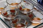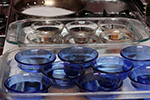 mixture blended, ramekins in their hot baths, it was time to make the caramel, half a cup of sugar at a time on medium heat. this is the most difficult part of the recipe, but i've done it enough that i knew what i was doing. i don't want to scorch the sugar, and when i pour the caramel into the ramekins i had to work fast, because it quickly solidifies. and put the pan back on the stove, i make sure to clean the caramel off of the lip where i poured otherwise it could drip to the outside of the pan and scorch that way.