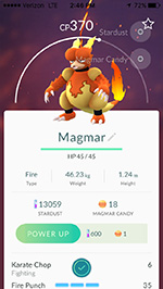 my 10k egg finally hatched, producing a magmar. it's not particularly strong, and even if i powered it up (maybe CP 700 maximum), it has a weak 6 point karate chop attack (not even fire, just a regular fighting attack). i'll sit on this one until i can get a better magmar, or use it against pokemons with fire-type weakness.