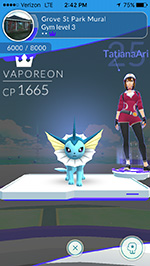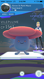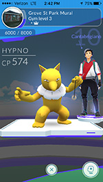 from my parents' house i could see a pokemon gym at the grove street playground. not only was it team mystic (my team) but it was a level 3 gym with an empty slot! i could join a gym without ever once battling anyone! this was an opportunity i couldn't pass up, so i went out to find this gym. i ran into my parents on street on their way home. "looking for pokemons?" they asked me as they drove by. i crossed the field to get close enough to the gym and added my best fighter, a CP 574 hypno that i evolved. i felt like a real poser standing shoulder-to-shoulder with level 24 and 25 trainers, with their CP 1500+ pokemons, which was 3x stronger than mine.