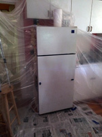 the idea i came up with was to wrap up the doors individually so they were in a pouch, and i'd spray into this tent. in theory it sounded fine, but in practice it was something else. tenting did manage to catch all the particulates, but working in such close proximity, i couldn't get a good distance to spray. also a few times the plastic tarp material touched the newly sprayed areas, sticking to them. i worked the freezer door then the fridge door, promising myself that this was the last coat, regardless of the outcome. it's an old fridge anyway, no need to spend so much effort fixing it up when i'll probably get rid of it within the next few years and get a better fridge that's energystar compliant.