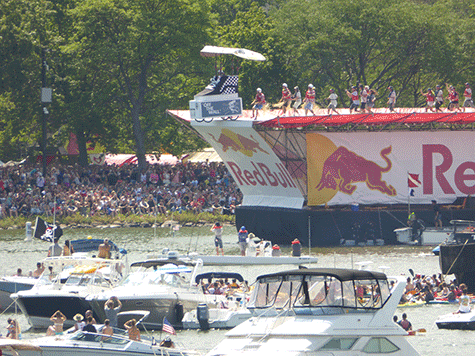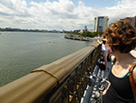 from across the river, the flugtag was actually hard to see. the only way i could see it was using the 30x zoom of my lumix digital camera. it wasn't all that exciting anyway, and after i saw one vehicle launch and then drop into the river, i figured i'd pretty much seen it all already. we tried making it into boston across the longfellow, by the further we got, the more crowded it became, until it was impossible to push the bikes through. in the end i threw the bikes over the barricade so we were back out onto the roadside bike lane, where there was no pedestrian traffic.