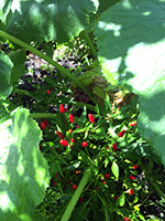 i gone the whole weekend without visiting the community garden and since there was no rain, i was due for a visit. instead of going home, i made a detour via the motorcycle. my eggplants are developing, but they have a weird shape with vertical ridges, not the smooth skin i'm used to with eggplants. maybe they'll fill out once they fully mature. i also collected a container of cherry tomatoes with a sprinkle of thai chili peppers.