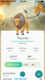 driving home, i was playing some pokemon go in the car. a few blocks away from my parents' house, i caught my first tauros. i'd actually seen them at gyms, and a few times i saw their distinctive silhouettes on the tracking display.