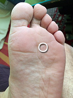 the bottom of the foot is an awkward place on the body to work with. i'm not as limber as i used to be, and contorting my body so i can see the bottom of my foot presented some challenge. plus with my failing eyesight, the distance from eye to foot is such that i can't see it clearly without my glasses, but with them on i can only focus at a distance. looking at the entry wound, i couldn't see anything else, but when i pressed down it'd hurt, which made me think i might've stepped on a piece of glass. glass splinters are the worst because they're virtually impossible and therefore hard to see.