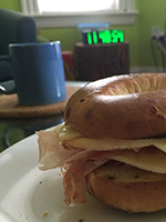 i was sort of hoping the pain would just go away on its own (like somehow my body would naturally eject the foreign glass material) but the pain was still there this morning, so much so that i devoted all my attention to finally removing the glass splinter. i first tried soaking my foot in an epson salt bath for 20 minutes. i thought it worked, but when i walked on the foot, the pain soon came back. the soak did seem to open up the puncture area a little bit more. so i tried covering up the region with some white elmer's glue and peeling off the glue once it dried, hoping to pull out the glass splinter in the process. while waiting for the glue to dry, i made lunch: an onion bagel sandwich with egg, swiss cheese, and prosciutto, all washed down with a mug of almond milk. hobbling around either on my heel or arch was actually more painful.