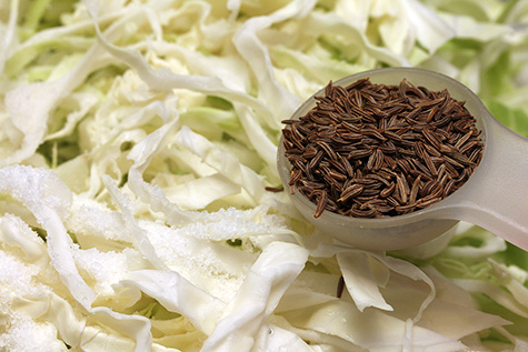 1 green cabbage (2.49 lb.), shredded 1 tbsp sea salt1 1 tbsp caraway seeds 1 apple, sliced (for weight) |