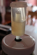 the mason jar airlock seems to be doing well, no overflow since i cleaned it this weekend. carbon dioxide was still being produced because the bell was pushed all the way up to the airlock lid. this is just the first day so some heavy fermentation is to be expected.
