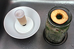 the apple weight didn't work because the fermenting mason jar overflowed this morning. luckily i had the whole setup in a bowl, so the cabbage juice didn't get everywhere. there was nothing to do but to remove the lid, clean the airlock, push down the sauerkraut and drain the excess fluid, and put everything back together again.