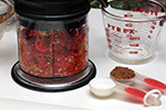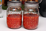 i was going to use all up the scotch bonnets to make a large batch of hot sauce, but decided to split peppers so i could experiment with two different flavors. after reading a bunch of recipes, i came up with a simple myself: chop up half the peppers (14) with a food processor, likewise do the same with a whole head of garlic (10 cloves), then add a tbsp of fine sea salt and 1/4 cup of chinese baijiu.