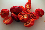 i never made hot sauce before, which is surprising, because i love spicy food. when i was in chongqing, all the little restaurants had a jar of homemade hot sauce; no respectable restauranteur would buy it. there are all sorts of ways to make hot sauce, from cooking to fermenting, and all sorts of ingredients, but the general consensus seems to be hot peppers and salt. when i think about habanero hot sauce, the top of my lip starts sweating involuntarily from taste memories. these sauces are not only typically spicy, but also very vinegary sour as well. for these scotch bonnets - which come from the same family as habaneros - i wanted a thicker sauce, and not sour at all, more like the yellow lantern pepper hot sauce i got from hainan.