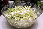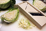 in the late evening i went ahead and prepared the head of cabbage i got from market basket. this will be my second jar of sauerkraut, having not even tasted the first jar yet. but i had that spare fermenting jar and i wanted to put it to use instead of having it just sit there. besides, cabbage is cheap, and sauerkraut is easy to make. i wanted to cut the cabbage with a mandolin slicer this time, but none of the attachments give me a satisfactory cut, shredded the cabbage to cole slaw texture instead of sauerkraut texture. i ended up shredded the cabbage by hand with a knife.
