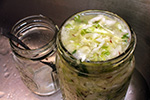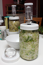 fearing the possibility of mold in my sauerkraut, i opened up my jar late last night to check the progress. what i thought was mold was either dried cabbage or dried brine. i then cleaned up the airlock and reassembled everything. since then, i haven't really noticed any sign of fermentation. there's some spittle on the spout, but not enough CO2 is being produced to push up the floating bell anymore. this is day 7, and i wonder if this is a sign that the sauerkraut is done fermenting and ready to eat now.