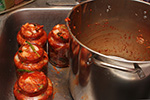 the cabbage had a chance to reduce for 2 hours, but normally i reduce to 6 hours before mixing in the other ingredients and packing the kimchi into jars. in the meantime, i soaked some jars in boiling water. probably not the best way to sanitize the jars, but easier than running them through the dishwasher which takes forever. i compared the old korean pepper powder to the new one i got. while the expired powder was dark maroon, the new powder was bright red. the lesson learned here is always use fresh chili powder!