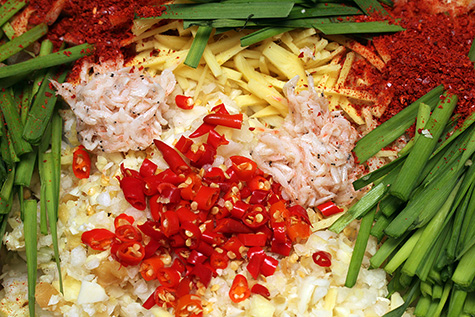 7.1 lbs. napa cabbage 2.1 lbs. daikon radish 5 tbsp fine sea salt 2 tbsp salted shrimp paste 12 tbsp red pepper powder |