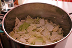 approaching 8pm i drained the reducing cabbage. the reason i do this is so that when i add the other ingredients, the kimchi doesn't become a soggy mess. i'm not making kimchi soup here! i managed to pour out a quart of cabbage juice. i saved it in a jar in case i needed to use it later, but the cabbage still retained enough juices so that it wasn't necessary. i then dumped the rest of the ingredients into the large stock pot (including 2 tbsp of salted shrimp paste and 12 tbsp of red pepper powder) and mixed everything by hand.