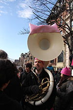 the march started at 11am, but bruce and i decided we'd leave at 11am, as the first hour or so was all speakers and performances, and we weren't particularly interested in either. i met jack and bruce at their place and together we walked down to porter square station. already we were seeing protestors, groups of people wearing pink pussyhats, or carrying signs. strange thing was many were all going in the opposite direction of the station, so i wonder if there was a local protest happening in union square somerville. the weather was especially nice, sun and blue sky, with temperature in the upper 40's and reaching upper 60's by midday.