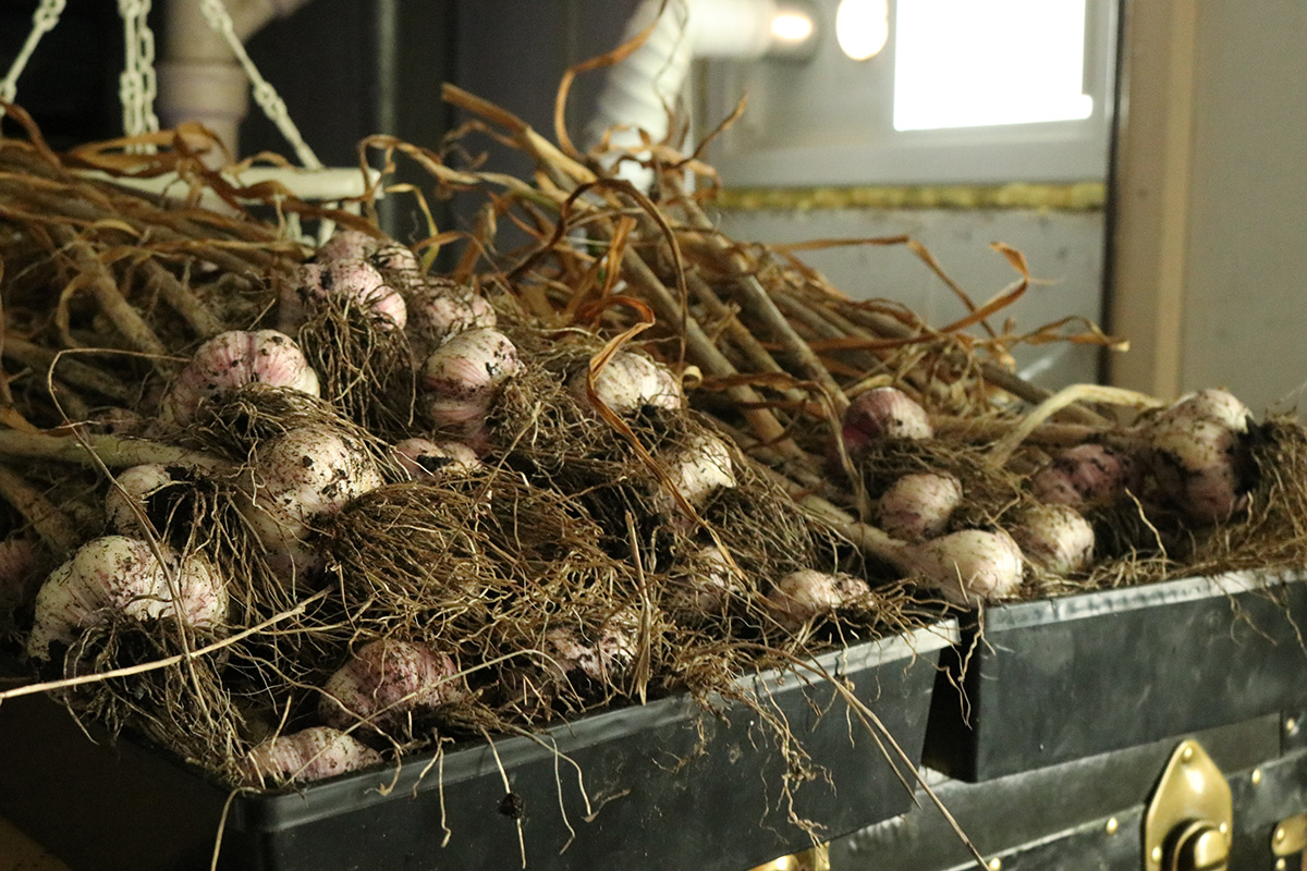 we dug up the garlics from RB4 on monday. today we dug up the rest. we continued with RB2, working down to RB1 and RB0, the garlics getting progressively bigger. there were some big ones, but i was kind of disappointed, as i thought there'd be more. the garlics on the left side of RB1 were overripe, and the heads had started to break apart into cloves. those will either be eaten or replanted since they'll be hard to keep. as for the rest, i put them in the cool dry basement so they can cure. my father and i tried a raw clove, it didn't taste particularly spicy, maybe the curing will enhance the flavor.