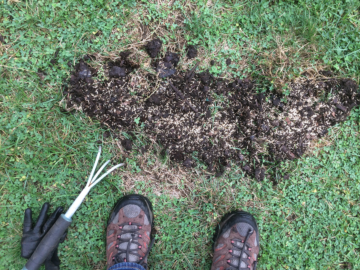 next i started patching all the bald spots in the backyard. all of them came courtesy of my sister's dog peeing on the lawn, a patch of yellow for every place she went to the bathroom. i first raked the areas with a cultivator just to clear out the dead grass and loosen the dirt, then i added either some top soil or compost, before sowing the grass seeds, mixing everything together, then watering. i also had a bag of leftover commercial grass patch mixture (a combination of fertilizer, newspaper pulp, and seeds) that i used to patch a few larger spots underneath the maple tree. like the grass seeds, i'm not sure how viable this patch mixture is. i ended up using about a fifth of our rain water supply.