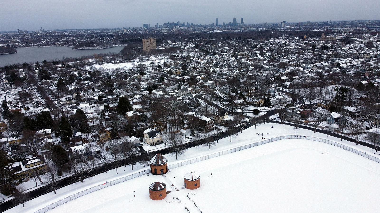 by the time i finished cleaning the solar panels, the snow had pretty much stopped. i put in a fresh battery (learned my lesson from yesterday, put the drone inside the house when not using) and decided to fly around a bit. all the flights today i'd put the phone into airplane mode, i never once had an app crash. i also checked to see if the map would still work with no wifi/data and the map data displayed fine, the app must've downloaded the map prior to flying. i decided to fly back to the reservoir as it was a short distance away. yesterday i only made it to the middle of the reservoir before turning back; today i reached all the way to the other side before 2 bars of RC signal reception made me return. i grabbed a better photo of the reservoir, with the trio of richardsonian romanesque gatehouses with views of fresh pond, the boston skyline, and children sledding down the hill.