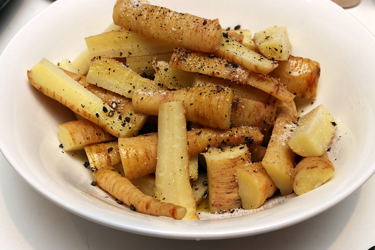 as for the parsnips, i first trimmed off the tops, then parboiled them in water for 8 minutes. this is to soften them up, as i read the thicker pieces can be tough if roasted directly, particularly the woodsy interior. once they finished boiling, i cut them into smaller pieces then tossed with olive oil, salt, pepper, paprika, and ground garlic powder. i then placed them on a pan and roasted them in the oven for 30 minutes, turning them with tongs every 10 minutes so they brown on all sides.