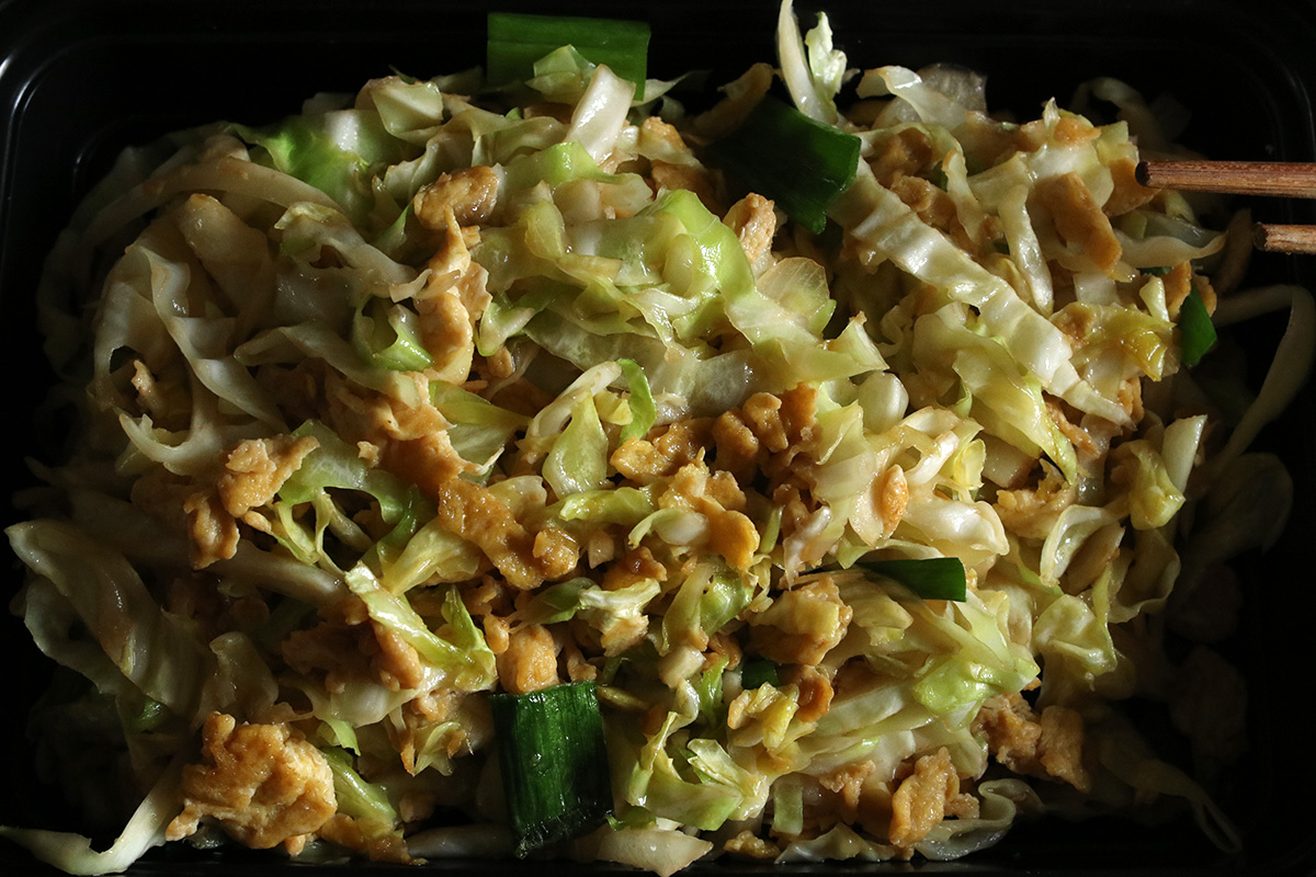 by the time i was all finished with gardening work, it was already close to dinnertime. my father braised some pork and beef (the leftover barbecued beef chunks from yesterday) and cooked up some cabbage with eggs.